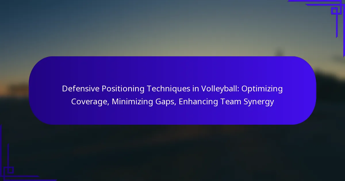 Defensive positioning techniques in volleyball are essential for optimizing coverage, minimizing gaps, and enhancing team synergy. By strategically positioning players and fostering effective communication, teams can adapt to various game situations and ensure that all areas of the court are well defended against opposing attacks.